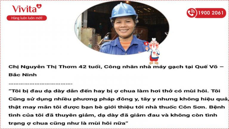 “Tôi bị đau dạ dày dẫn đến hay ợ chua làm hơi thở có mùi hôi. Tôi đã sử dụng nhiều sản phẩm giúp chữa tình trạng này rồi nhưng không thấy khỏi. May mắn là tôi được bạn bè giới thiệu viên uống Côn Sơn Hoàn Bách Vị. Sản phẩm này hỗ trợ điều trị bệnh hôi miệng và cũng giúp cải thiện vấn đề dạ dày nữa. Sau 2 hộp sản phẩm, tôi thấy bệnh tình thuyên giảm, dạ dày không còn đau, tình trạng ợ chua cũng biến mất.”